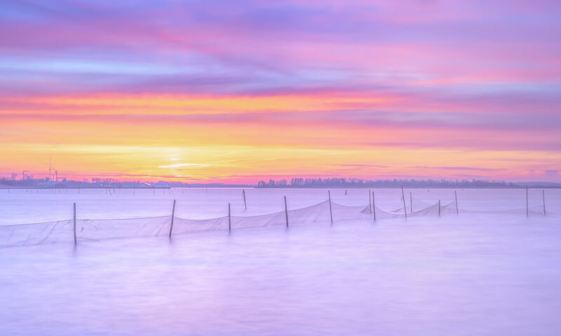 De stilte op het water en het mooie licht van de late zon achter de wolken, het is het Lauwersmeer ten voeten uit. Dit is het water bij de Egbert Schuldinkplaat, vlak bij de sluizen aan de Friese kant. Genoemd naar een boswachter, die er in het begin bij was.